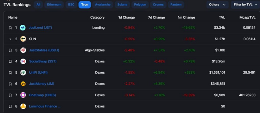 SponsoredJustLend, sebuah platform pinjaman terdesentralisasi dengan TVL tertinggi di TRON, melesat naik lebih dari 19% pada bulan lalu. Selain itu, ada sebuah algorithmic stablecoin yaitu JustStables (USDJ), yang naik lebih dari 2% dalam periode waktu yang sama. Kemudian, ada juga SocialSwap dan UniFi, yaitu dua decentralized exchange (DEX) yang masing-masing mengalami peningkatan lebih dari 6% dan 550%.
