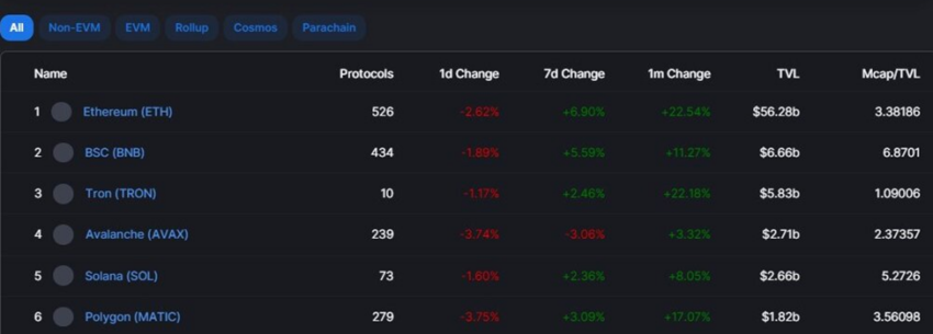 Metrik terbaru menunjukkan bahwa TRON telah naik ke posisi ketiga, tepat berada di bawah Ethereum dan Binance Smart Chain (BSC). Itu artinya, chain ini telah berhasil menampung lebih banyak TVL daripada Avalanche, Solana, dan Polygon.