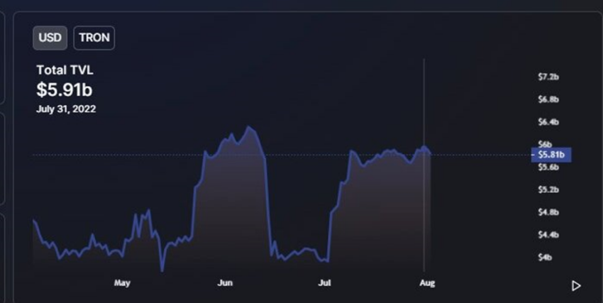 Dalam dua tahun terakhir ini, TRON telah menjadi salah satu smart contract keuangan terdesentralisasi (decentralized finance) yang paling populer. Menurut Be[In]Crypto Research, blockchain ini telah meningkat sebesar 49% dalam TVL pada bulan Juli. Padahal pada tanggal 1 Juli, TVL TRON baru mencapai US$3,95 miliar. Lalu, nilainya melesat tajam menjadi US$5,91 miliar pada hari terakhir di bulan yang sama.