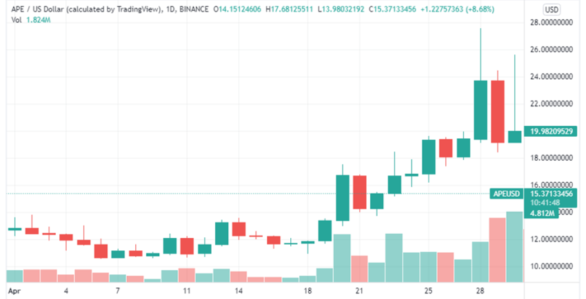 APE mengawali hari pertama bulan April dengan diperdagangkan di harga US$12,70 dan mencapai titik tertinggi dalam bulan itu pada angka US$26,91, yang terjadi 28 April. Lalu, APE menutup bulan keempat 2022 dengan harga US$20,01. Secara keseluruhan ada 57% kenaikan antara harga di pembukaan dan penutupan bulan April.