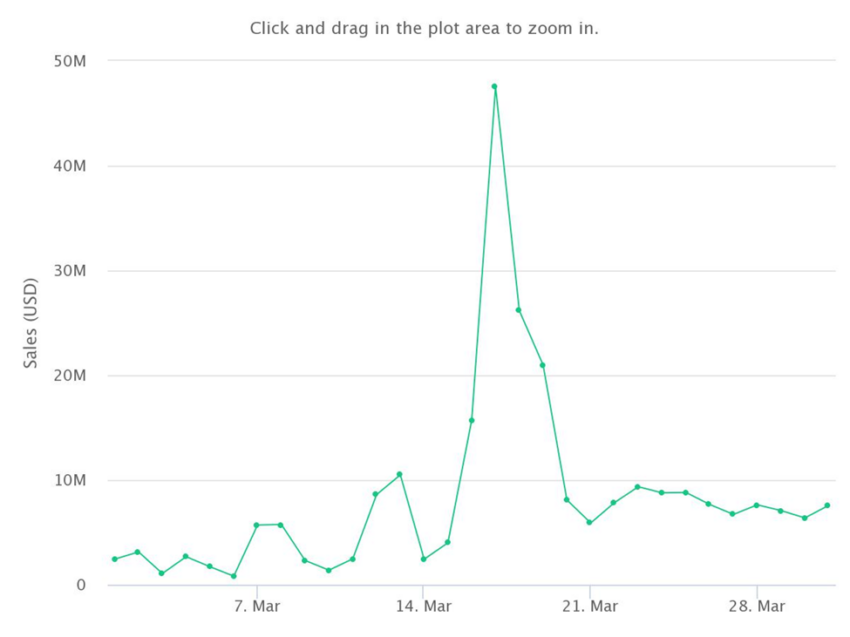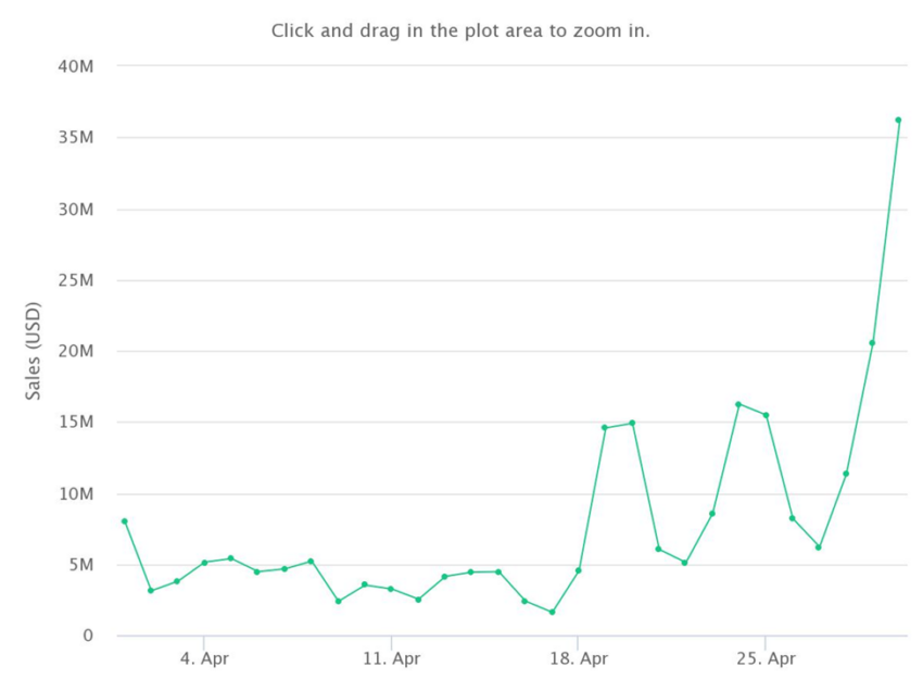 Secara keseluruhan, volume penjualan BAYC di bulan Maret kurang lebih sebesar US$256,95 juta. Angka tersebut melonjak 106% dibanding penjualan saat Februari, yang berjumlah US$124,42 juta.