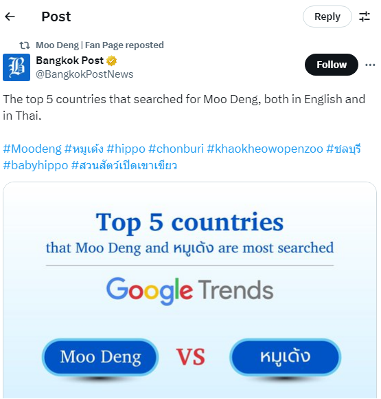 Bahkan berdasarkan laporan Bangkok Post, pencarian keyword Moo Deng di laman mesin pencarian, mengalami peningkatan signifikan di beberapa negara. Mulai dari Inggris, Australia, Jerman, Amerika Serikat (AS) hingga Jepang.