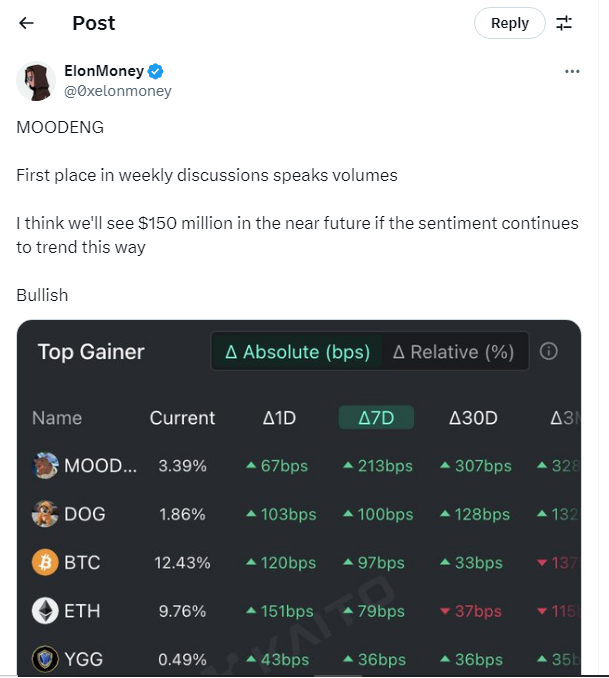 Salah satu peneliti kripto, menyebut bahwa MOODENG menjadi topik pertama dalam diskusi mingguan dan dirinya memandang bullish terhadap kondisi itu.