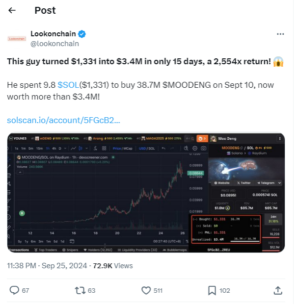 Trader tersebut mengubah investasi awalnya yang sebesar US$1.331 menjadi US$3,4 juta hanya dalam kurun waktu 2 pekan. Awalnya, ia melepas 9,8 token Solana (SOL) yang dimilikinya senilai US$1.331 untuk membeli token MOODENG sebanyak 38,7 juta.