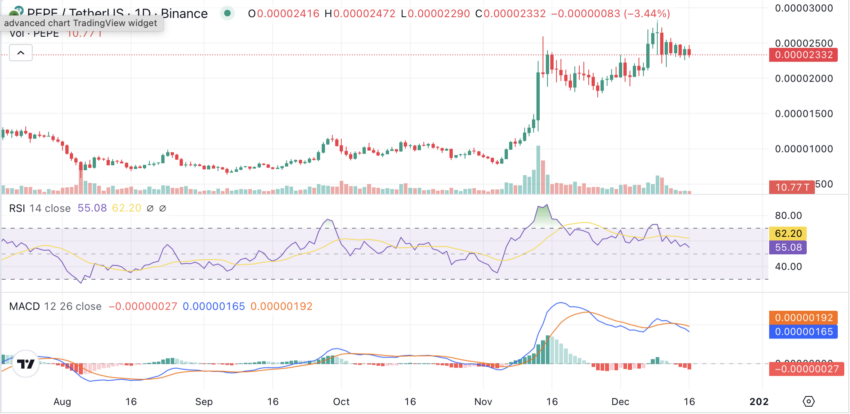 Indikator teknikal mengonfirmasi hilangnya momentum ini. Pada grafik harian, RSI tercatat di angka 55,08, jauh di bawah zona overbought (jenuh beli) 70 di mana PEPE sempat berada saat lonjakan sebelumnya. Sementara itu, MACD menunjukkan bearish crossover, di mana garis sinyal melintasi garis utama MACD ke bawah—situasi yang umumnya menandakan perlambatan di pasar kripto.