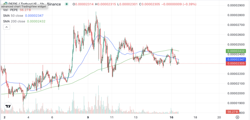 Dalam jangka waktu yang lebih pendek, grafik per jam menunjukkan fase ketidakpastian bagi PEPE. SMA 50 dan SMA 200 bergerak berdekatan, namun mengonfirmasi bearish crossover yang jelas, meski tekanan jual tetap terasa. Harga saat ini, sekitar US$0,00002305, berosilasi di dekat level support teknikal, namun kehilangan dorongan yang dibutuhkan untuk menembus resistance di kisaran US$0,00002347.