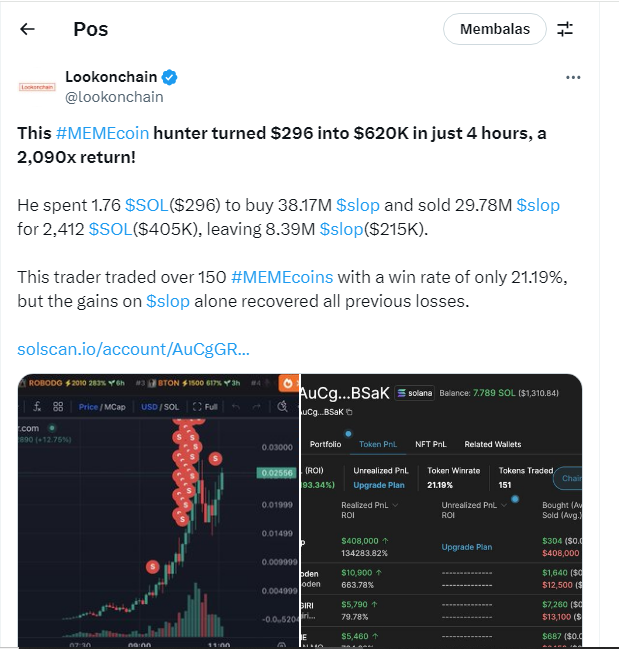 Laporan Lookonchain menyebutkan, trader tersebut awalnya membenamkan 1,76 token Solana (SOL) yang setara dengan Rp4,6 juta untuk memborong meme coin SLOP sebanyak 38,17 juta token. Namun beberapa jam kemudian, begitu harga SLOP melesat naik, trader tersebut langsung melego 29.78 juta SLOP yang setara dengan 2.412 SOL atau setara dengan US$620 ribu (senilai lebih dari Rp9 miliar).