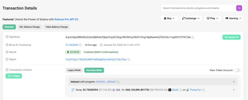 Ini bukan sekadar dongeng perdagangan, melainkan realita yang terdokumentasi dengan baik. Pada Jumat, 3 Januari, seorang trader berani menginvestasikan 32,75 SOL (sekitar US$7.130 / Rp115.536.543) untuk membeli 268,12 juta Hive AI (BUZZ), yang mewakili hampir 30% dari pasokan sirkulasi token berbasis meme dan AI ini.