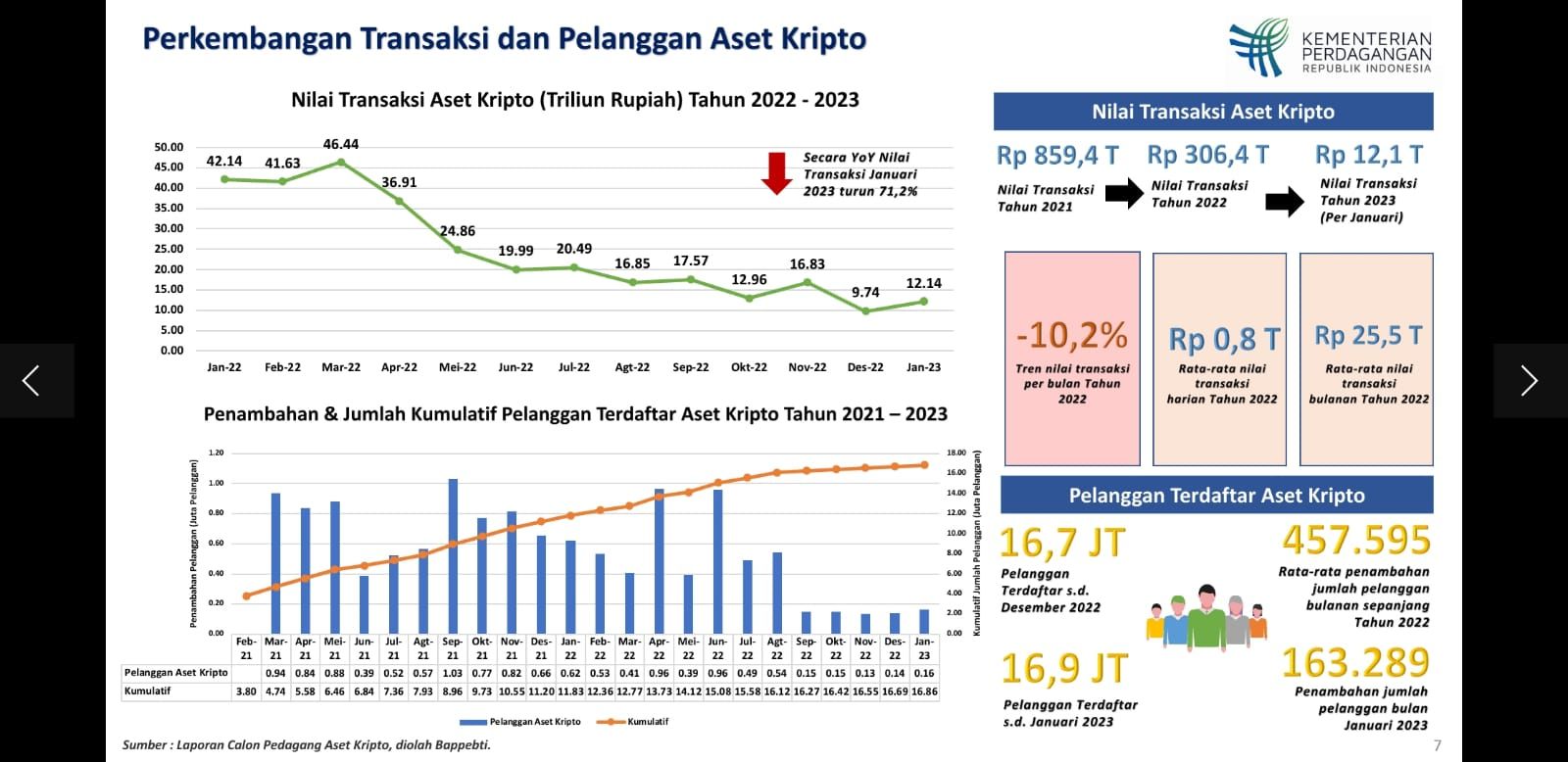 Perdagangan aset kripto di Indonesia rupanya masih belum pulih. Berdasarkan data Badan Pengawas Perdagangan Berjangka Komoditi (Bappebti), pada periode Januari 2023 nilai transaksi aset kripto di Indonesia hanya mencapai Rp12,1 triliun.