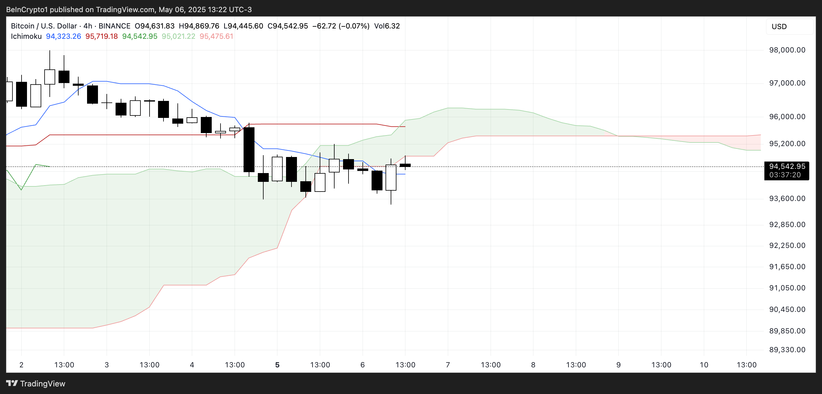 Grafik Ichimoku Cloud saat ini untuk Bitcoin mencerminkan pasar dalam konsolidasi, dengan sedikit nada bearish. Aksi harga berada sangat dekat dengan Kijun-sen (garis dasar) biru, yang biasanya mewakili momentum tren jangka menengah.