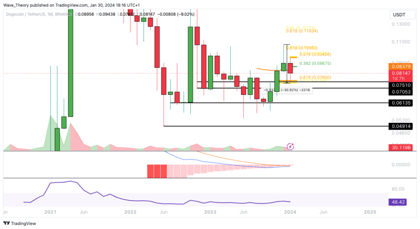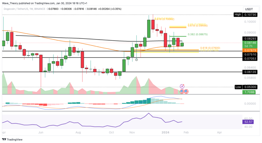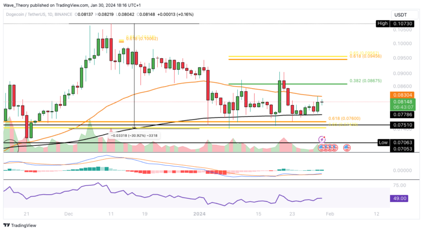 Untuk mengakhiri tren korektif ini, Dogecoin perlu menembus level golden ratio di sekitar US$0,095.