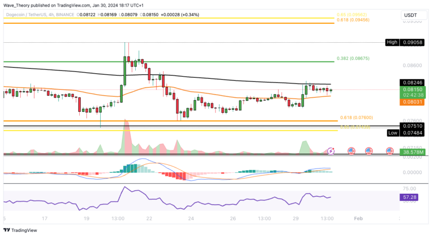Pada grafik 4 jam Dogecoin, indikator-indikator yang ada memancarkan sinyal yang beragam alias ambigu. Adapun serangkaian EMA telah membentuk death cross, yang mengonfirmasi tren bearish dalam jangka pendek.