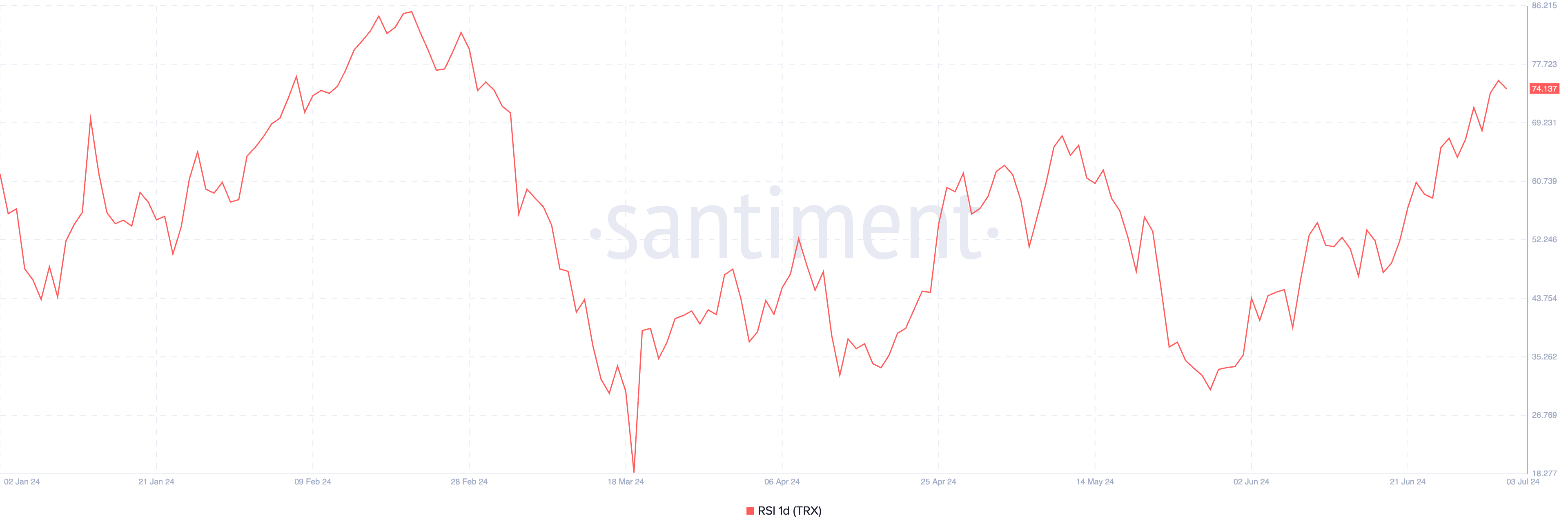 Seperti yang terpantau secara on-chain, kenaikan Relative Strength Index (RSI) koin ini mengonfirmasi bahwa reli harga TRON mendapat dukungan dari permintaan riil. Pada saat publikasi, RSI TRX ada di angka 74,13. Terakhir kali metrik ini kembali ke nilai setinggi itu yakni pada tanggal 2 Maret.