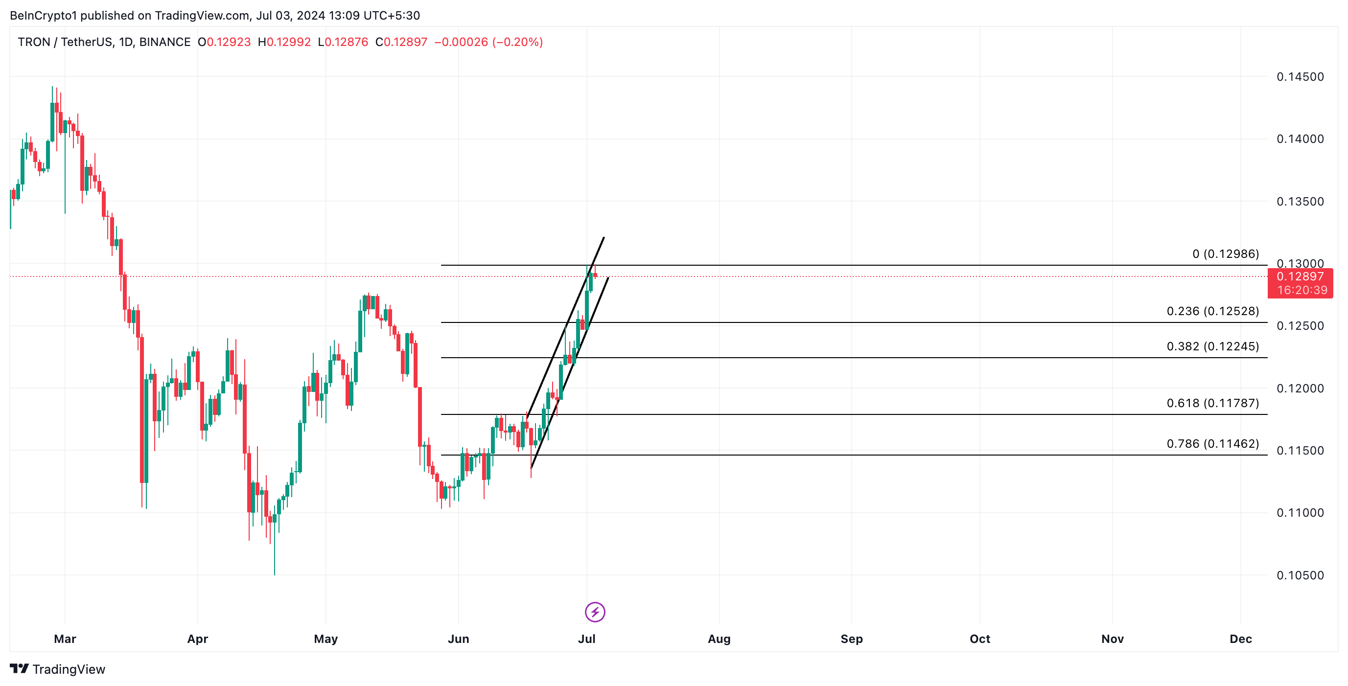Lonjakan harga TRX telah menyebabkan terbentuknya saluran naik atau ascending channel. Saluran ini adalah sinyal bullish yang terbentuk ketika harga aset secara konsisten bergerak di antara dua garis paralel yang miring ke atas.