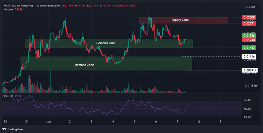 Sementara itu, analisis singkat menunjukkan harga token MASK diperdagangkan dalam zona permintaan antara US$0,01786 dan US$0,01447 pada saat publikasi.