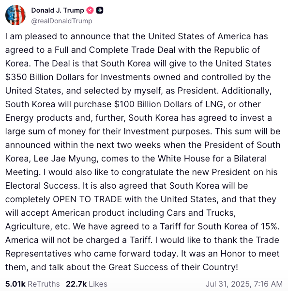Presiden Trump mengumumkan kesepakatan tersebut di Truth Social, menyatakan bahwa Korea Selatan akan menginvestasikan US$350 miliar dalam proyek-proyek di AS. Paket ini mencakup pembelian gas alam cair dan produk energi senilai US$100 miliar. Kim Yong-beom, kepala departemen kebijakan pemerintah Korea, mengonfirmasi bahwa pengurangan tarif berlaku untuk mobil dan barang lainnya mulai 1 Agustus.