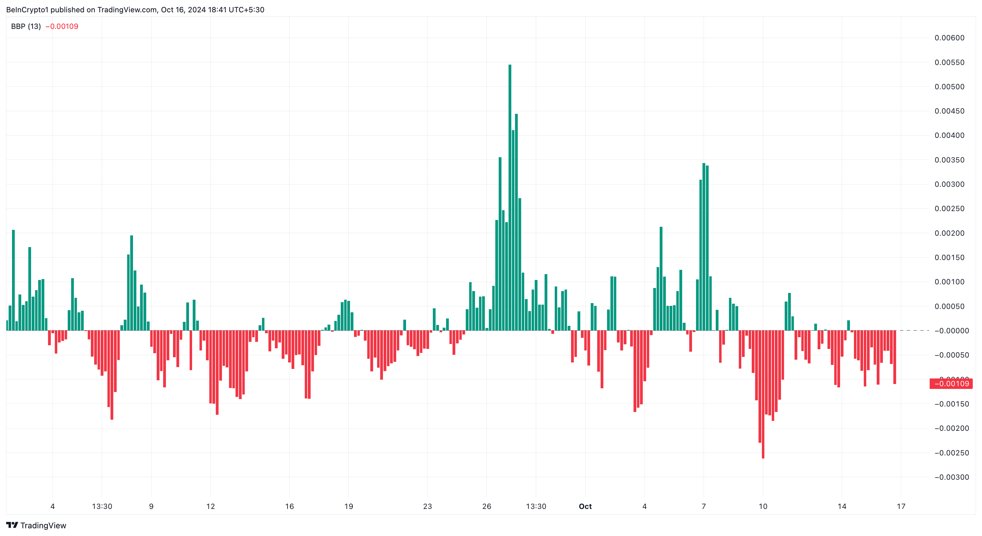 Menyusul perkembangan ini, Bull Bear Power (BBP) menunjukkan penurunan besar pada grafik 4 jam KAMA/USDT. BBP mengukur kekuatan pembeli (bull) dibandingkan dengan penjual (bear).