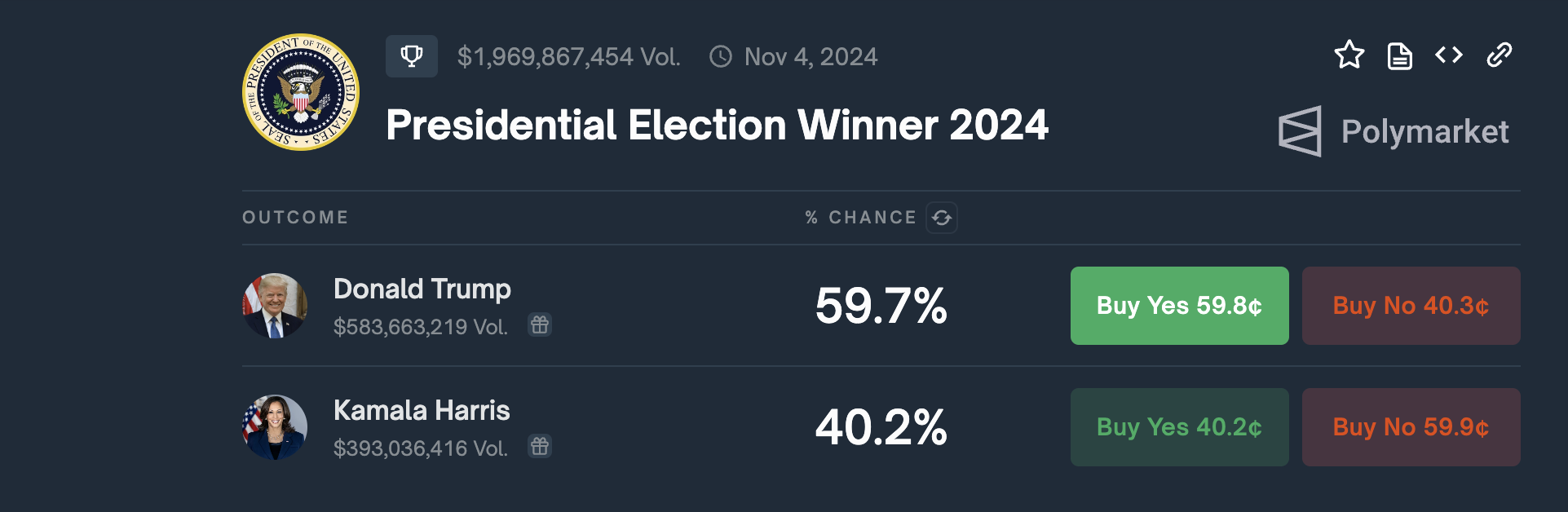 Namun, saat ini, situasinya telah berubah. Menurut taruhan Polymarket, peluang Trump menjadi presiden AS bulan depan telah melonjak menjadi 59,7%. Harris, di sisi lain, tertinggal dengan 40,2% mendukung wakil presiden.