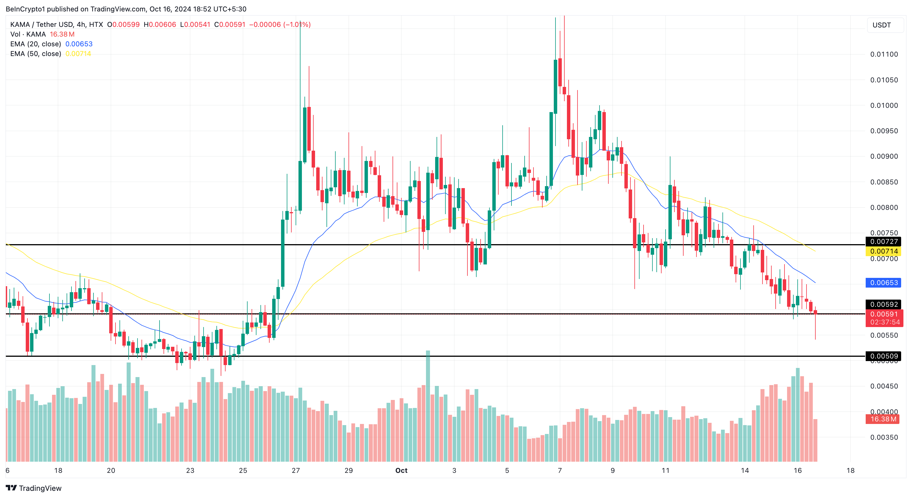 Melihat grafik 4 jam, harga KAMA berada di bawah Exponential Moving Averages (EMA) kunci. Seperti yang terlihat di bawah, EMA 20 (biru) dan EMA 50 (kuning) semuanya berada di atas nilai meme coin tersebut.