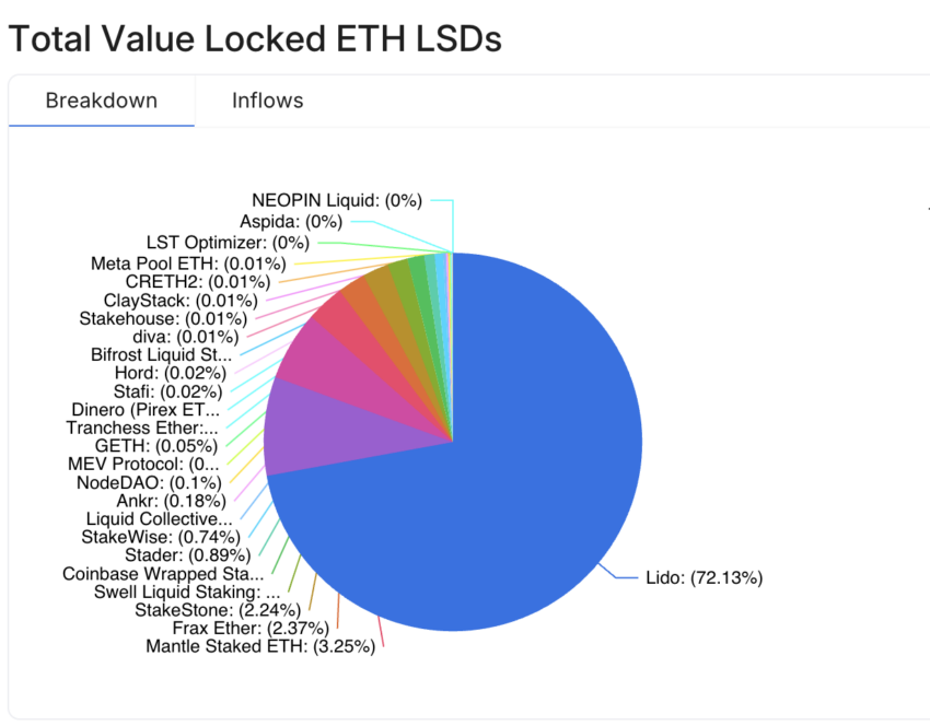 Lido Finance, yang unggul di sektor liquid staking, sekarang memiliki pangsa pasar sebesar 37%. TVL protokol ini mencapai angka US$22,65 miliar, dan tercatat sudah tumbuh 4,50% dalam tujuh hari terakhir. Bahkan, protokol ini nyaris mencapai tonggak sejarah dengan hampir 10 juta staked ETH. Angka ini merepresentasikan 72,13% dari seluruh liquid-staked Ethereum.