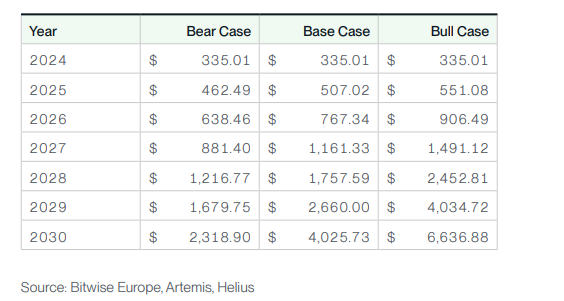 Sebuah laporan terbaru dari Bitwise Asset Management memproyeksikan SOL mencapai US$2.318,90 hingga US$6.636,88 pada tahun 2030, didorong oleh peningkatan alamat aktif harian dan adopsi blockchain yang kuat.