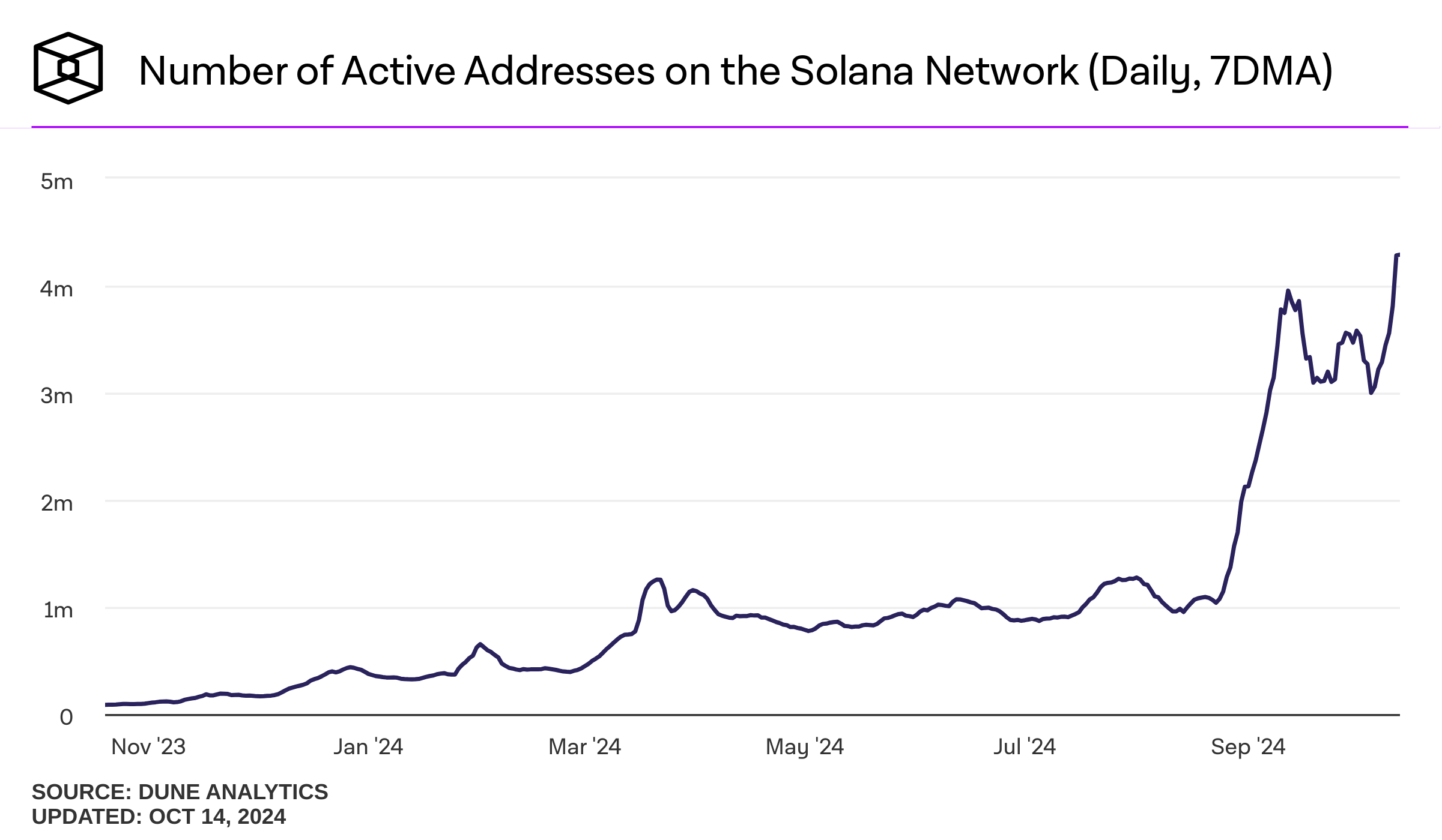 Data dari Artemis mengungkapkan bahwa alamat aktif harian (DAA) di jaringan Solana mencapai rekor baru. Pada bulan Oktober, jaringan Solana membukukan lebih dari 4 juta alamat aktif pada hari-hari tertentu. Sejak bulan September, DAA konsisten berada di atas 3 juta per hari.