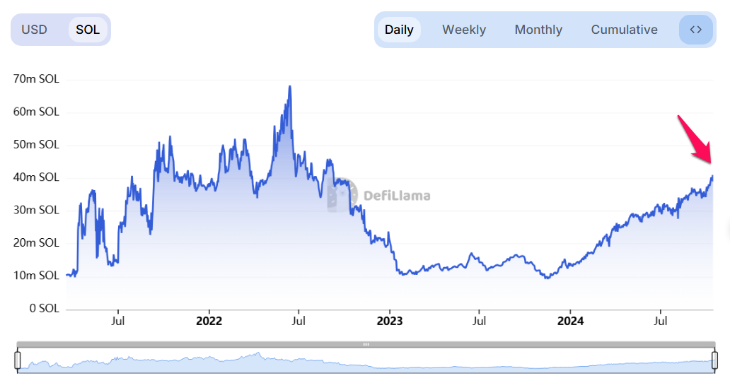 Bersamaan dengan rekor TVL, data dari DefiLlama mengungkap bahwa hingga 15 Oktober, lebih dari 40 juta token SOL terkunci dalam protokol DeFi. Angka ini terus merangkak naik dari mulanya hanya 14 juta SOL di awal tahun 2024.