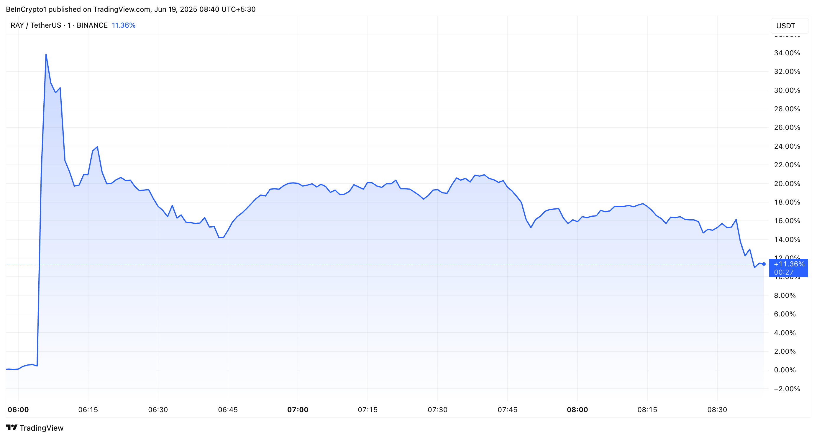 Pengumuman ini langsung mengerek harga RAY sebesar 34,3% di awal sesi perdagangan Asia. Data dari BeInCrypto menunjukkan lonjakan dari kisaran US$2,07 menjadi US$2,78 hanya dalam hitungan menit. Kapitalisasi pasar juga naik menjadi lebih dari US$655 juta.
