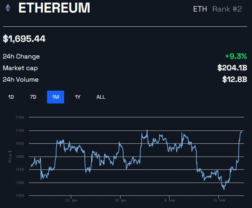 Harga Ethereum sukses menyentuh level US$1.700 beberapa jam yang lalu selama sesi perdagangan Asia pada Kamis pagi (17/2). Aset ini menunjukkan kenaikan gemilang sebesar 9,3% hari ini karena harganya sudah kembali merebut level tertinggi multi-month. Namun, terdapat resistance krusial di level ini.