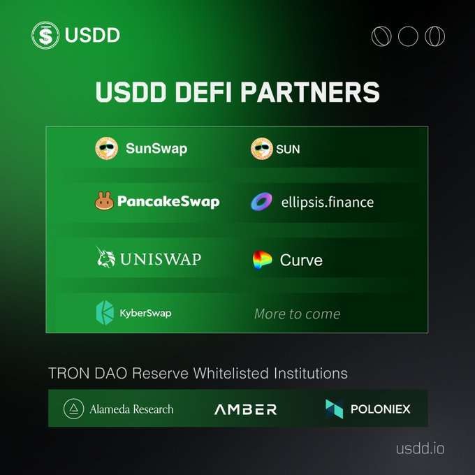Sejauh ini, 1 USDD yang setara dengan 1 dolar Amerika Serikat (AS) telah tersedia di sejumlah protokol decentralized finance (DeFi) di antaranya termasuk SUN.io, SunSwap, PancakeSwap, Uniswap, Elipsis.finance, Curve Finance, dan KyberSwap.