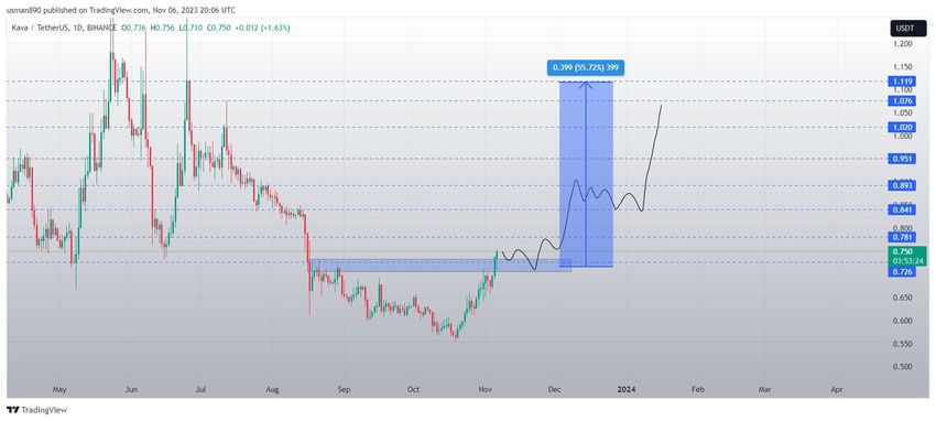 Crypto trader Cryptoknight890 mengatakan bahwa harga KAVA kemungkinan akan meningkat menjadi US$1 karena harga terpantau sudah breakout dari resistance jangka panjang.
