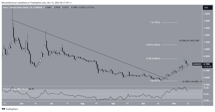 Sejak breakout tersebut, altcoin ini telah mengikuti garis tren ascending support yang sangat curam (garis putus-putus). Saat melakukannya, harga KAVA mencapai area resistance US$0,87 tetapi tidak berhasil breakout. Dalam hal ini, level resistance retracement Fib 0,382 adalah yang berperan menciptakan area tersebut.