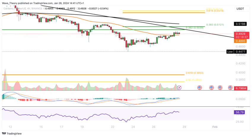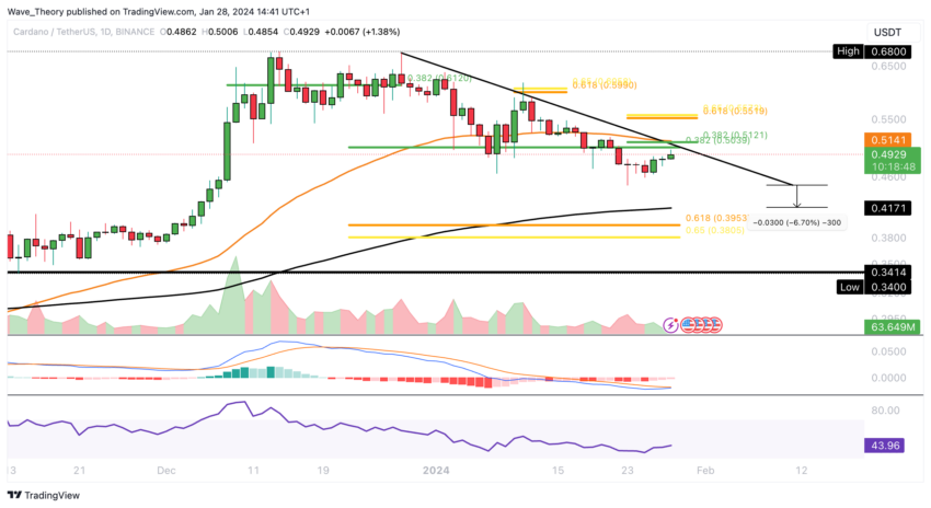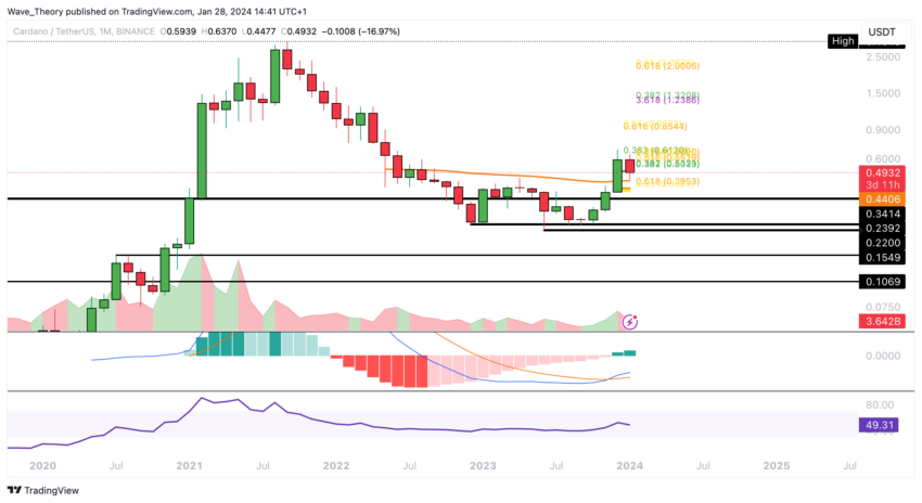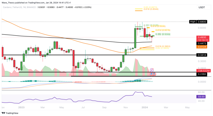 Selain itu, histogram MACD juga telah menunjukkan penurunan bearish selama lima minggu terakhir. Sementara itu, indikator RSI saat ini tengah berkitar di zona netral. Jika support EMA 200 minggu gagal bertahan di kisaran US$0,447, maka Cardano akan menemukan support Fib signifikan berikutnya di golden ratio US$0,40.