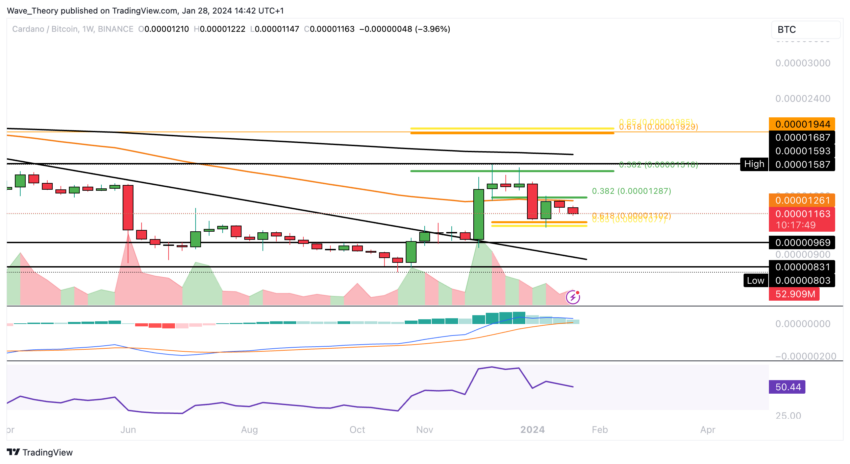Dalam satuan Bitcoin (BTC), ADA berhasil memantul dari support golden ratio di sekitar 0,000011 BTC dua minggu yang lalu. Namun, pekan lalu, ADA ternyata harus menelan penolakan bearish dari resistance Fibonacci 0,382 di kisaran 0,00001287 BTC pada EMA 50 minggu.