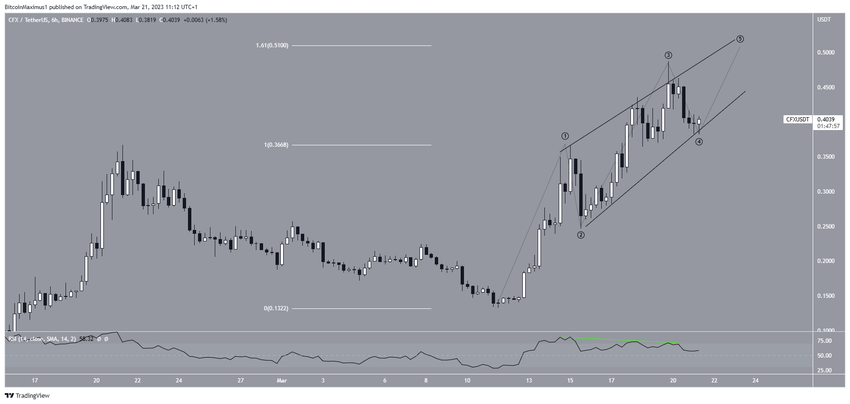 Analisis teknikal dari time frame enam jamnya menunjukkan bahwa harga token CFX mungkin sedang berada di dalam ascending wedge. Ascending wedge ini dikenal sebagai pola bearish, yang artinya bahwa pola ini seringkali mengarah pada aksi penurunan. Dalam konteks indikator wave count sebelumnya, pola ini cocok sebagai bagian dari diagonal akhirnya. Jika benar, harga Conflux hari ini (22/3) akan bullish dan memulai kenaikan menuju level US$0,51.