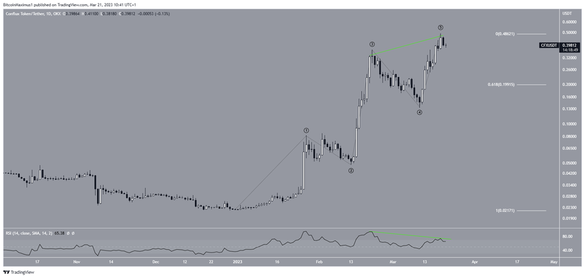 Selain itu, harga CFX sepertinya sedang berada di gelombang kelima dan terakhir dari kenaikan yang dimulai sejak awal tahun. Sejauh ini, pergerakan ini telah menyebabkan kenaikan hingga 2.000%. Oleh karena itu, kemungkinan besar akan terjadi penurunan selanjutnya.