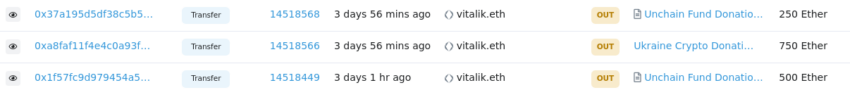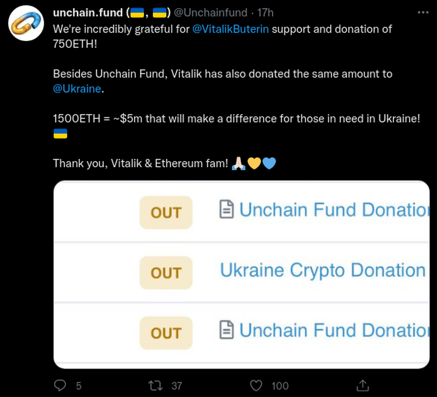 Pada hari Rabu, 6 April 2022, sebuah proyek amal yang digagas oleh para aktivis blockchain bernama Unchain Fund, mengungkapkan melalui Twitter bahwa mereka telah menerima donasi sebanyak 750 ETH (sekitar Rp34,8 miliar) dari pendiri Ethereum ini.