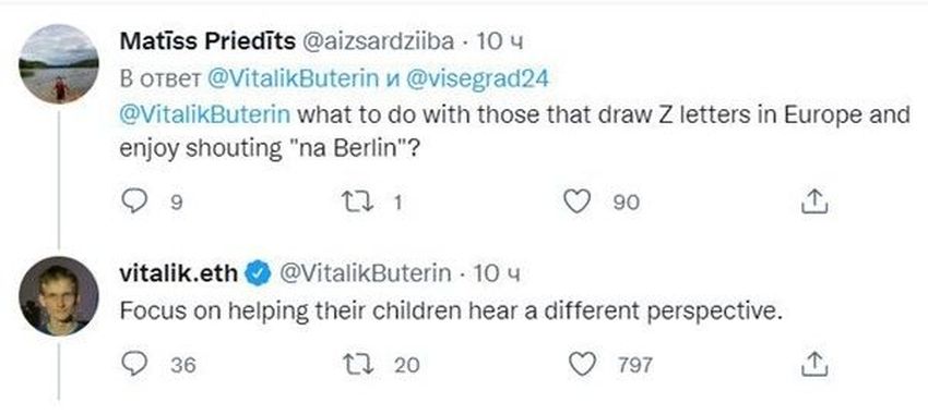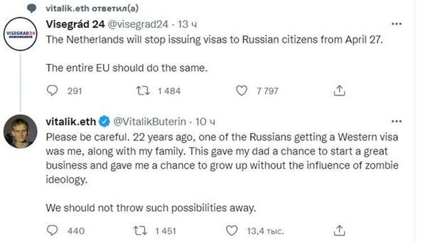 “Tolong hati-hati [dengan keputusan menghentikan penerbitan visa]. 22 tahun lalu salah satu warga Rusia yang mendapatkan visa negara Barat adalah saya, bersama dengan keluarga saya. Ini memberikan kesempatan bagi ayah saya untuk memulai sebuah bisnis yang bagus, dan memberikan saya sebuah kesempatan untuk tumbuh tanpa pengaruh ideologi zombie,” balas Buterin terhadap cuitan dari Visegrad 24 mengenai langkah Negeri Kincir Angin tersebut.