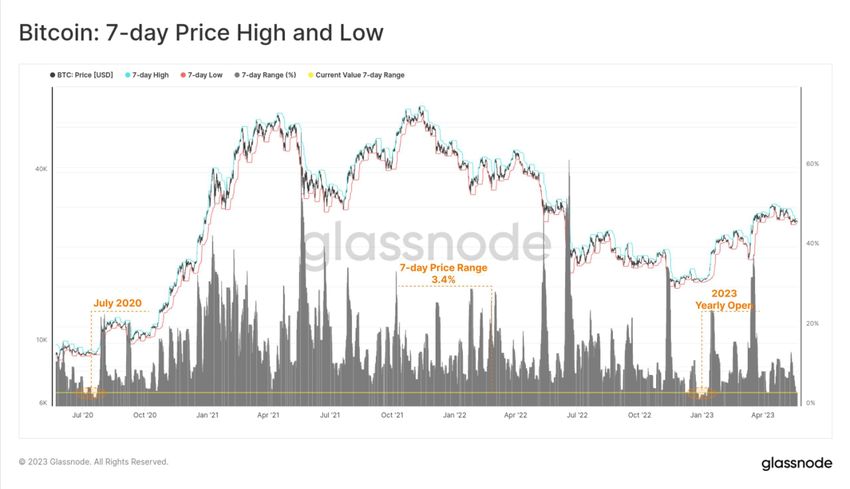 Mereka menyebutkan bahwa kisaran harga Bitcoin selama tujuh hari terakhir hanya sebesar 3,4%. Selain itu, kisaran tersebut telah terkonsolidasi dalam salah satu kisaran terketat dalam tiga tahun terakhir.