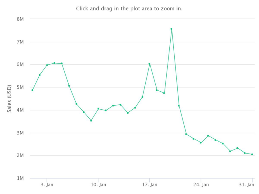 Aktivitas penjualan di bulan Juni juga tercatat sebagai volume penjualan bulanan NFT terendah pada tahun 2022. Selain itu, ini adalah pertama kalinya penjualan bulanan Axie Infinity berada di bawah area US$4 juta sejak bulan Februari 2021. Pada bulan Februari 2021, penjualan bulanan yang tercatat berkisar pada angka US$1,67 juta.