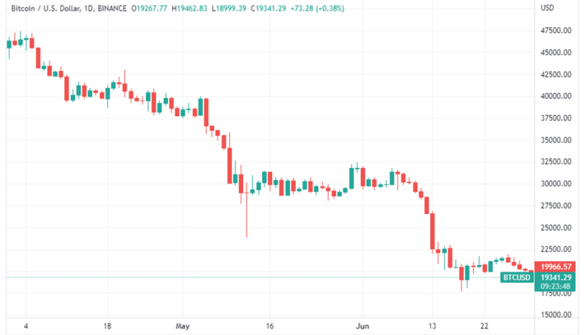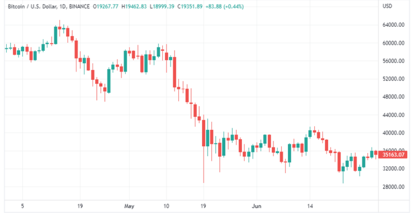 Sebagai perbandingan, harga Bitcoin pada tanggal 1 April 2021 adalah US$58.926,56. Sedangkan, pada tanggal 14 April, harganya mencapai titik tertinggi triwulanan di harga US$64,863,10. Kemudian, Bitcoin menguji level terendah triwulanan di angka US$28.893.62 pada 22 Juni. Bitcoin menutup kuartal kedua tahun 2021 di harga US$35.040,84. Antara harga pembukaan dan penutupan Q2 2021, berarti telah tercatat aksi penurunan sebanyak 40% secara keseluruhan.