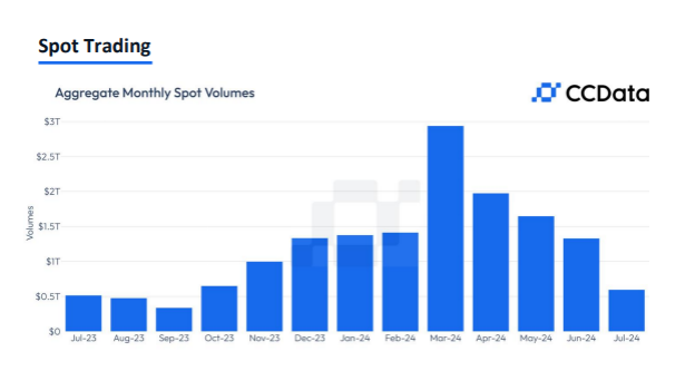 “Pada Maret, volume perdagangan spot mencapai US$2,94 triliun. Penurunan dipicu oleh stagnasi pasar, di mana harga Bitcoin mengalami perlambatan sebesar 7,10% pada Juni dan juga terdapat periode di mana BTC bergerak di bawah level US$54.000,” beber laporan.