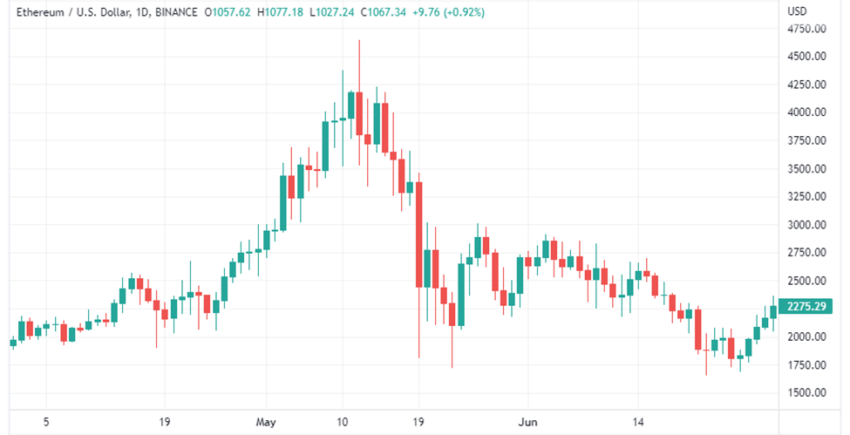 Akibatnya, terjadi penurunan parah sebesar 46% dari bulan Mei menjadi US$813,52 miliar pada bulan keenam tahun 2021. Di sisi lain, capaian tertinggi satu hari untuk bulan Juni 2021 yaitu pada level sekitar US$41,91 miliar. Volume perdagangan Ethereum pada bulan Juni 2022 mencerminkan iklim kripto pada periode yang sama tahun lalu. Di tahun ini, volume perdagangan koin kripto terpopuler kedua ini adalah pada angka US$562,03 miliar, dengan nilai tertingginya dalam satu hari, yaitu di area US$45,16 miliar.