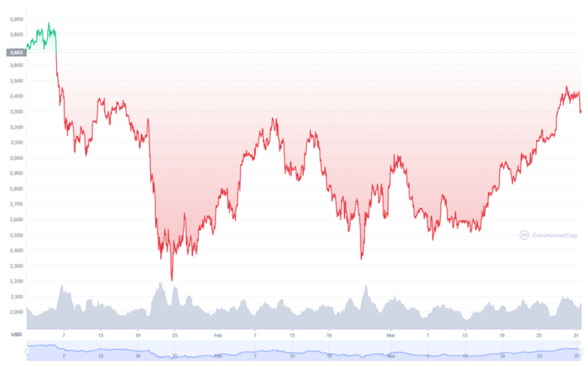 ETH membuka hari pertama tahun 2022 dengan harga US$3.683,05. Lalu, mencapai level tertinggi selama kuartal pertama 2022 pada tanggal 4 Januari, di angka US$3.876,79. Harga ETH ketika hari terakhir di kuartal pertama 2022 sebesar US$3.281,64.