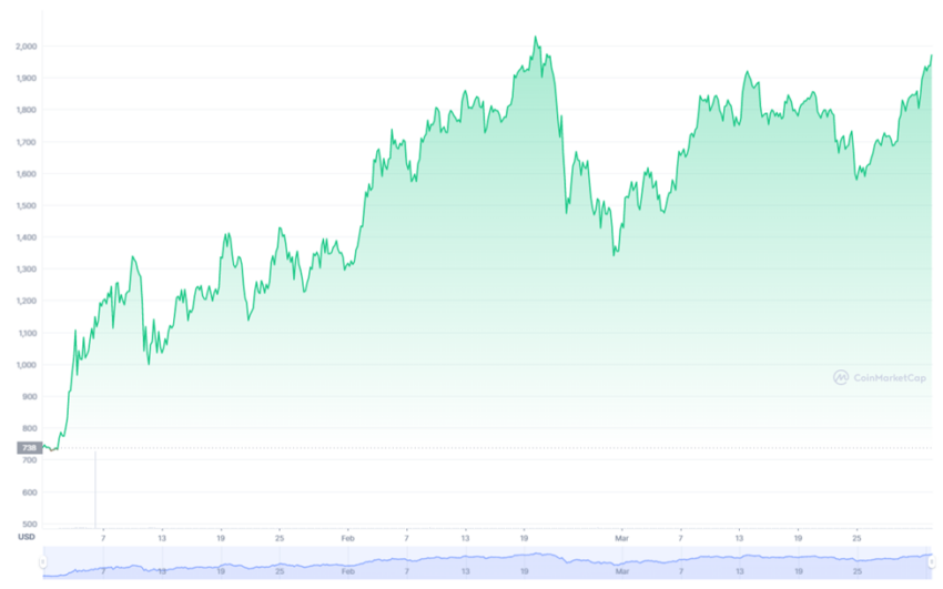 Sekarang, mari kita bandingkan dengan data Ethereum di kuartal pertama 2021. Pada 1 Januari 2021, harga ETH bertengger di titik US$737,71, kemudian mencapai level tertingginya selama Q1 2021 di tanggal 20 Februari, dengan harga US$2.036,29. ETH mengakhiri kuartal pertama 2021 di harga US$1.918,36.