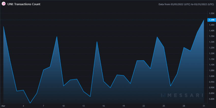 Sementara itu, total angka transaksi Uniswap untuk bulan Maret 2022 adalah 33.279 transaksi, dengan rekor tertinggi harian 1.493 transaksi di tanggal 31 Maret 2022.
