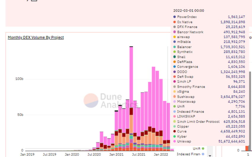Uniswap mencatatkan volume perdagangan sekitar US$51 miliar pada bulan terakhir kuartal pertama 2022, menurut Be[In]Crypto Research.