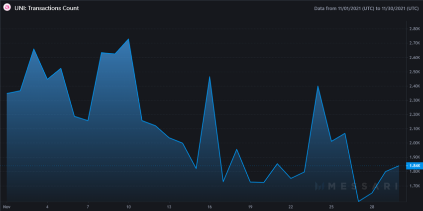 Akan tetapi, di sepanjang tahun 2022, angka transaksi Uniswap merosot di bawah 40.000. Pada Januari 2022, terpantau angka transaksi Uniswap sebesar 38.849, dengan rekor tertinggi harian 1.932 transaksi di tanggal 22 Januari 2022.
