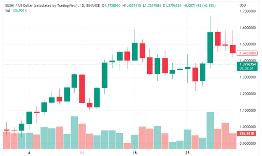 Secara keseluruhan, terlepas dari adanya penurunan dalam volume perdagangannya, ada kenaikan sebanyak 46% antara harga pembukaan dan penutupan SUSHI di bulan Juli.