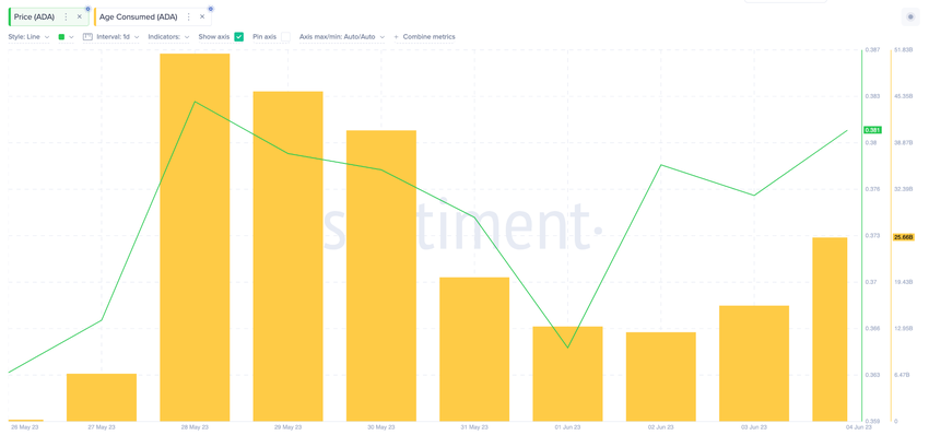 Grafik di bawah ini menunjukkan bahwa Age Consumed ADA saat ini mencapai 25,6 miliar, yang artinya sudah melonjak 9.500% dari 261 juta yang tercatat pada 26 Mei.